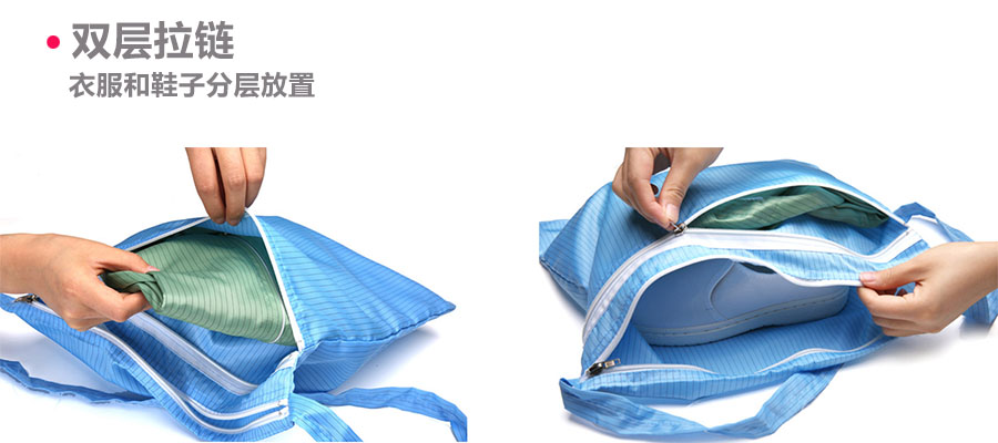 特點:雙層拉鏈(里外兩層結(jié)構(gòu),衣服和鞋子可以分開)