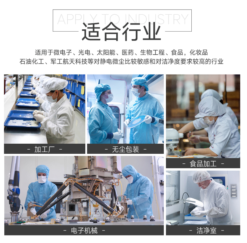 使用場景:無塵車間、實(shí)驗(yàn)室、生物制藥、半導(dǎo)體微電子、電子電器等