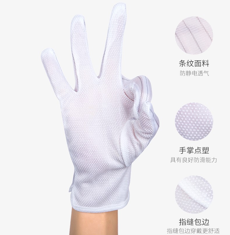 防靜電點(diǎn)塑手套又稱防靜電點(diǎn)塑防滑手套,是采用特種防靜電滌綸布制作而成,材質(zhì)由滌綸和導(dǎo)電纖維組成,導(dǎo)電纖維間距為10mm,手心加上PVC防滑顆粒,防滑性好、耐磨性好,手套具有極好的彈性和防靜電性能,能避免人體產(chǎn)生的靜電對(duì)產(chǎn)品造成破壞,適合在電子行業(yè)、半導(dǎo)體、醫(yī)療生物、光伏、光學(xué)及無(wú)塵車(chē)間使用。