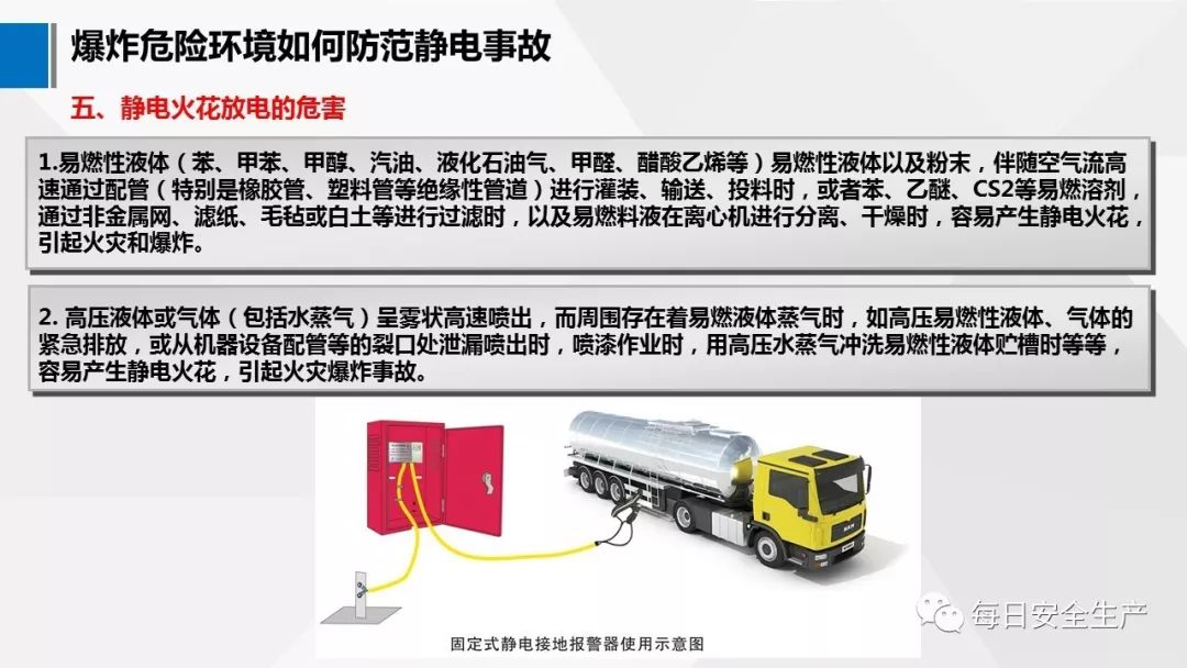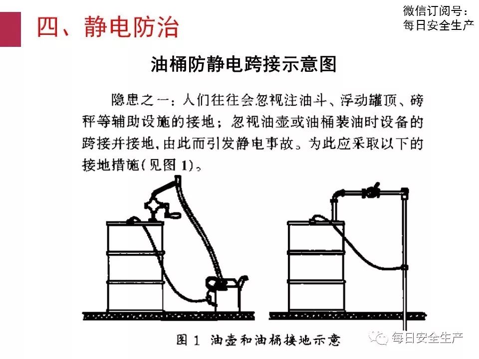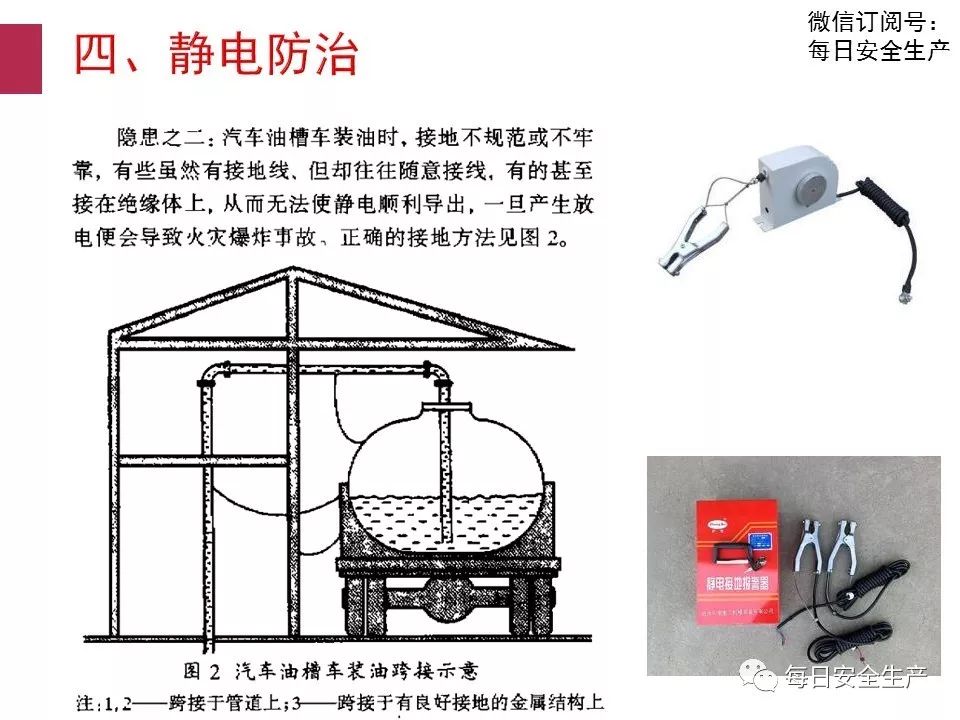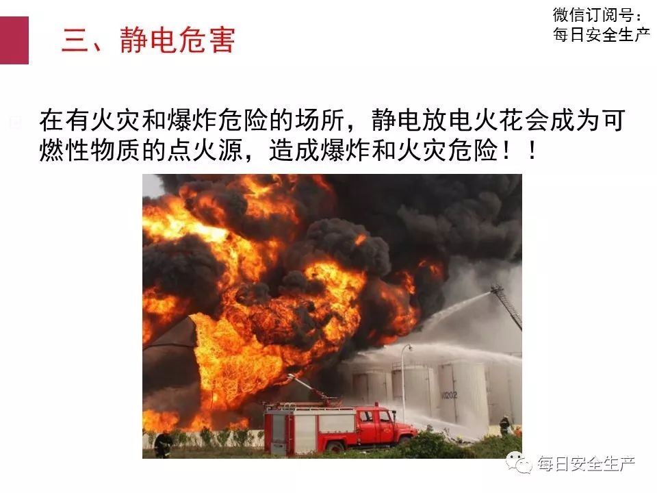 1) 靜電起火。由于油管無靜電接地或靜電接地不良、采用噴濺式卸油、卸油 中油罐車無靜電接地等原因,造成靜電積聚放電點燃油蒸氣,會產(chǎn)生爆炸燃燒。