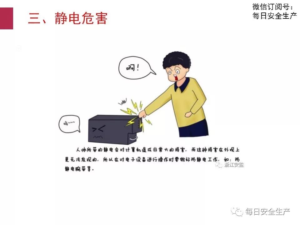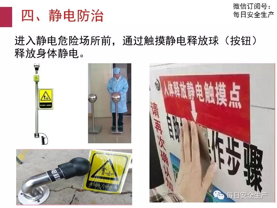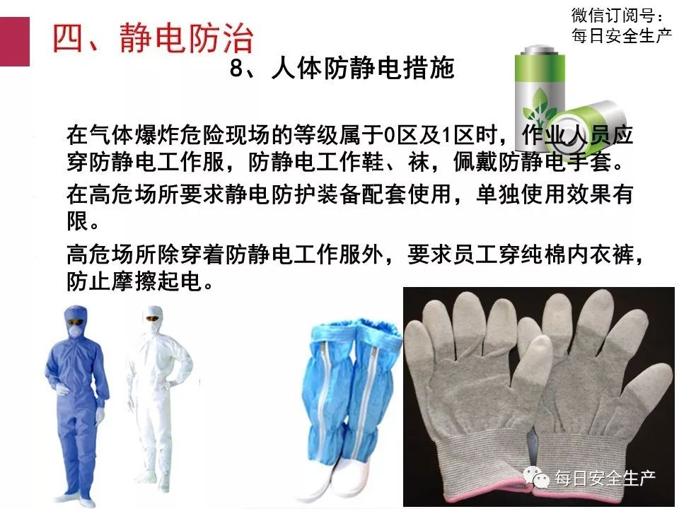 此時人觸及其他物體會產(chǎn)生火花放電并受到電擊。人體活動中防靜電措施主要有?穿導電性鞋;工作服和內(nèi)衣褲不使用化纖面料;穿混有導電性纖維或用防靜電劑處理的防靜電工作服;工作地面作導電化處理等。