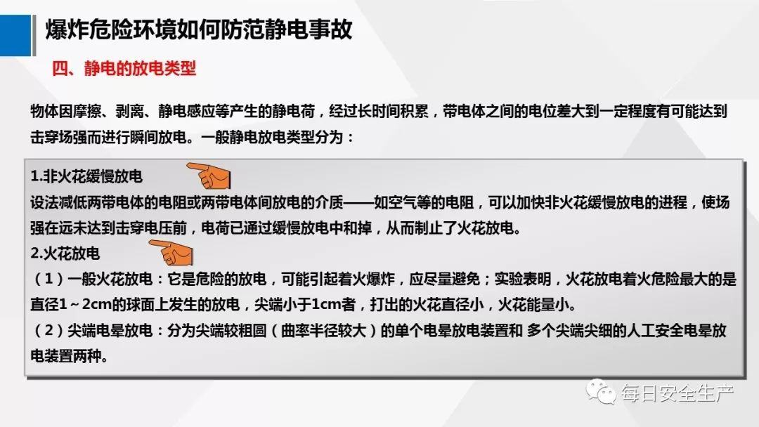 3)職工穿著化纖服和絕緣膠鞋在現(xiàn)場作業(yè),一方面,人體與衣服摩擦會產(chǎn)生靜電,人體在穿脫衣服時也會產(chǎn)生靜電。另一方面,穿膠鞋的人在地面上走動后,人體的靜電壓高達5000~15000V,而人體的電容量,一般約為100~200PF,如果人體所帶靜電壓為10000V,則放電時的能量就超過了5mJ,足以引燃可燃氣體,造成靜電放電起火。