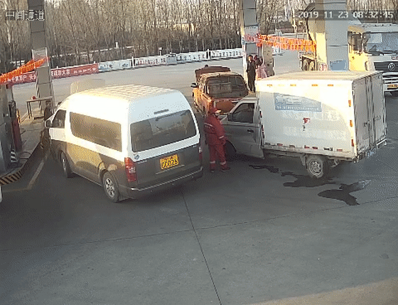 11月23日, 一加氣站員工在引導車輛有序排隊時,發(fā)現(xiàn)一輛白色廂式貨車后車廂不斷有液體滲漏到地面,并有白色氣體從車廂中向四周擴散。發(fā)現(xiàn)這一異常后,加氣站員工立即通知廂式貨車駕駛員,駕駛員在將車窗搖下的一瞬間,車輛瞬間轟燃,火焰順勢向四周擴散,將加氣員以及周圍車輛瞬間吞噬。