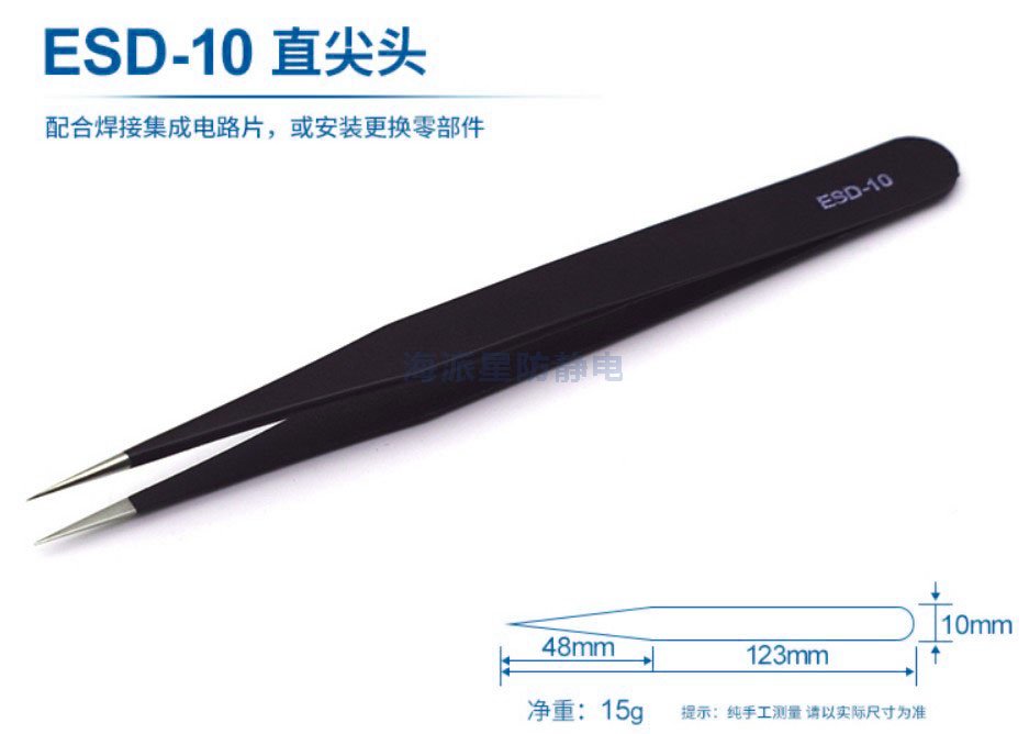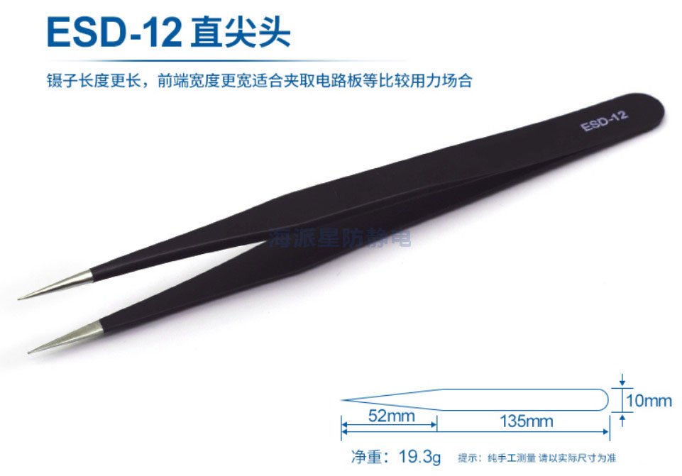 ESD-12 鑷子長度更長,前端寬度更寬,適合夾取電路板等比較用力場合