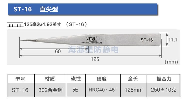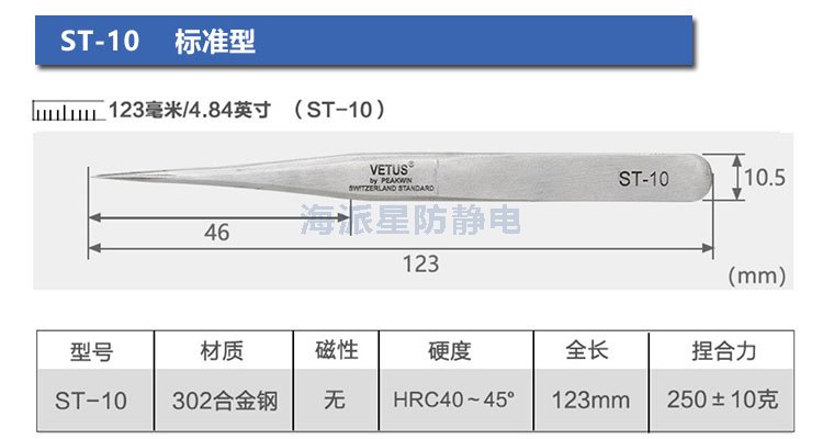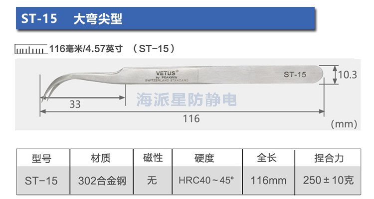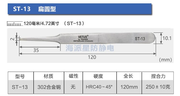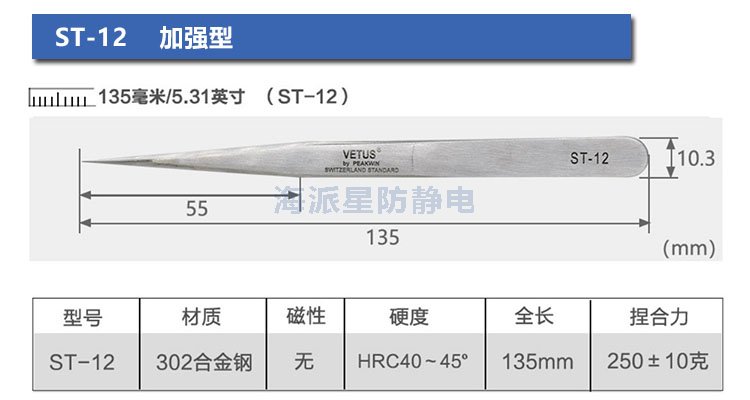 ST-12 鑷子長度更長,前端寬度更寬,適合夾取電路板等比較用力場合